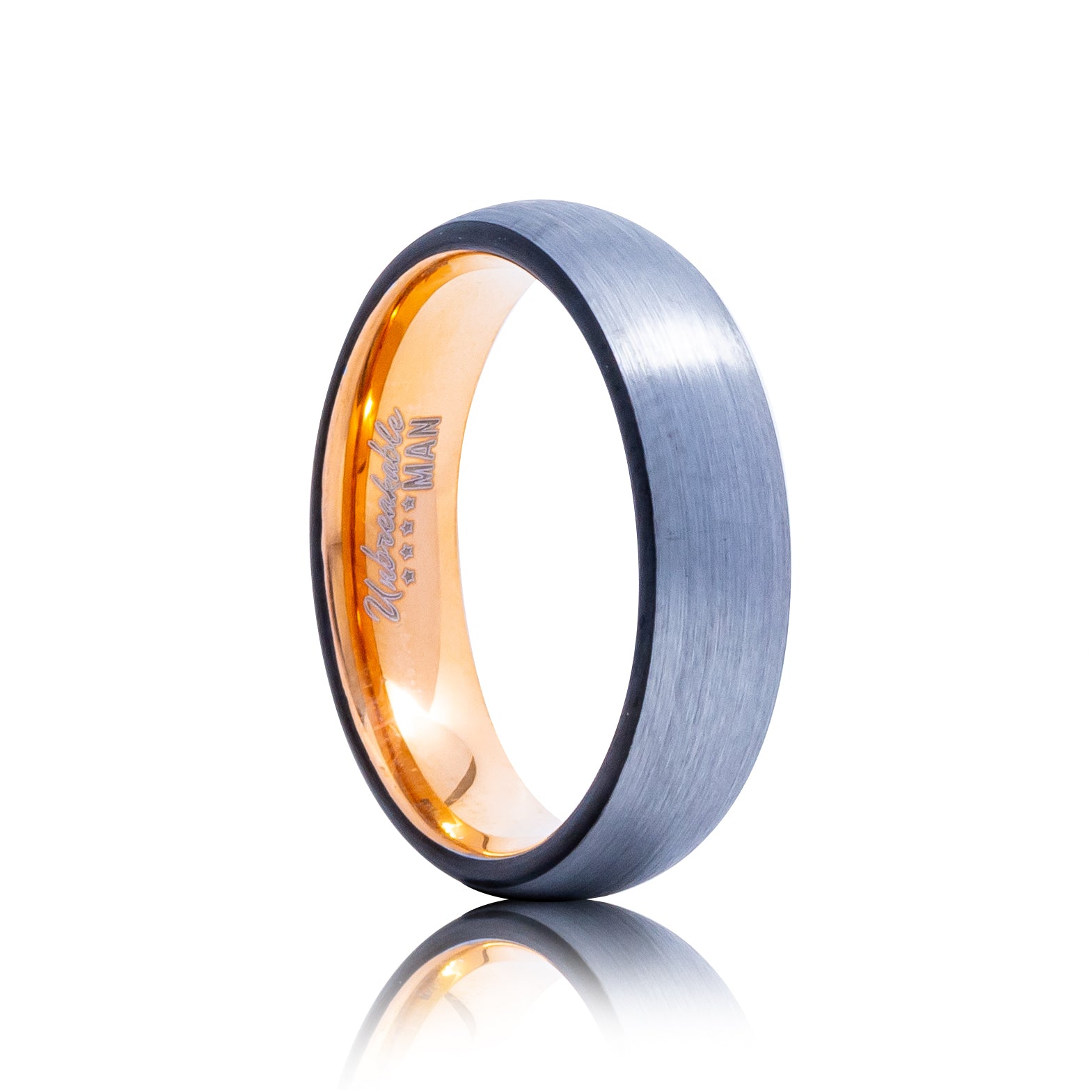 This Courage Tungsten Ring rocks a black edging and a secret surprise - 18ct Rose Gold Plating on the inside. Show off your style and make a statement with this unique and daring 6mm-wide man-jewellery. Rock the Rose Gold - let your ring do the talking!