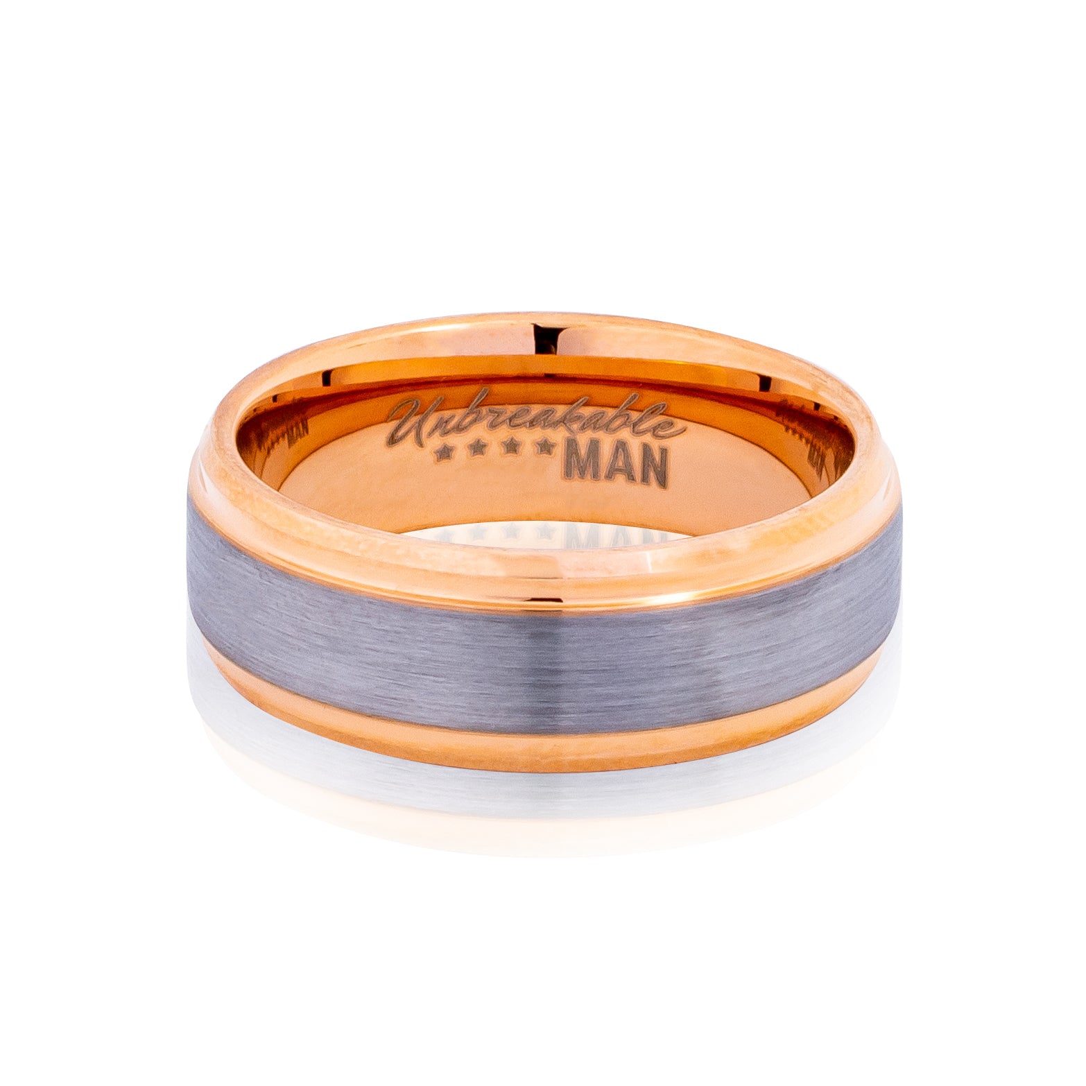 Treat yourself to a rose gold plated Respect tungsten ring! Sleek brushed tungsten with 8mm width for a sleek, elegant look. Its super comfortable fit and bold statement will make your wedding day (and every day after) shine!